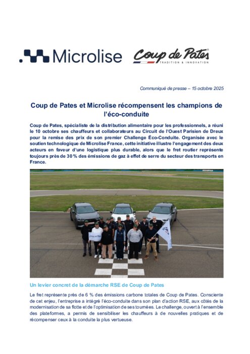 Coup de Pates – acteur majeur de la distribution alimentaire pour les professionnels – a choisi d’impliquer directement ses chauffeurs dans la baisse de ses émission carbone, dont le fret représente près de 6%. Consciente de cet enjeu, l’entreprise a intégré l’éco-conduite dans son plan d’action RSE, aux côtés de la modernisation de sa flotte et de l’optimisation de ses tournées.
