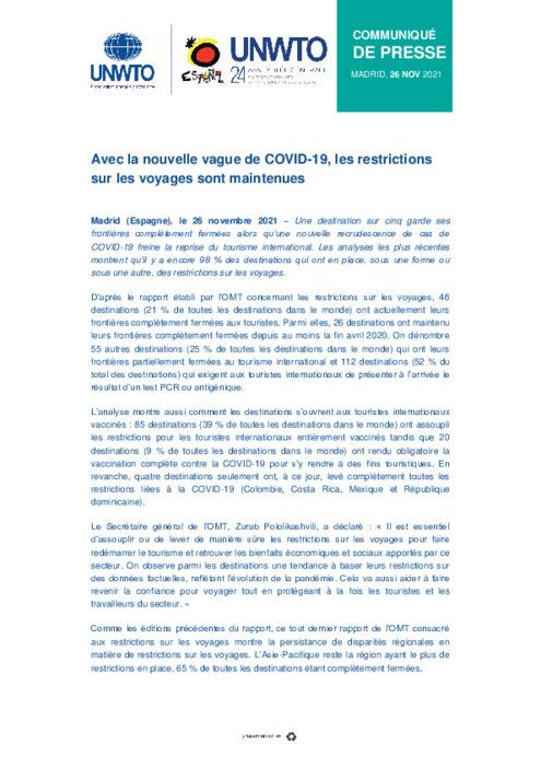 Métiers 26 novembre 2021 - 12:40 Une destination sur cinq garde ses frontières complètement fermées alors qu’une nouvelle recrudescence de cas de COVID-19 freine la reprise du tourisme international. PDF (137 Ko) Télécharger