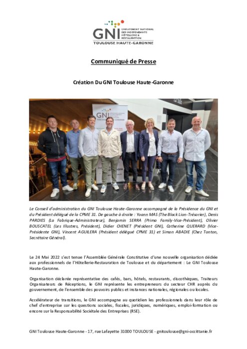 Le 24 Mai 2022 s’est tenue l’Assemblée Générale Constitutive d’une nouvelle organisation dédiée aux professionnels de l’Hôtellerie-Restauration de Toulouse et du département : Le GNI Toulouse Haute-Garonne.