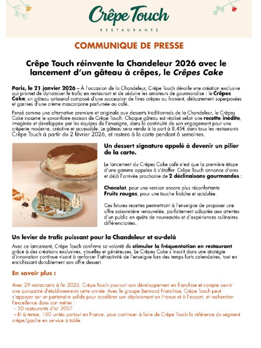 À l’occasion de la Chandeleur 2026, Crêpe Touch bouscule la tradition en dévoilant un gâteau de crêpes aussi généreux que gourmand. Empilées avec précision et sublimées par des garnitures créatives, les crêpes deviennent un véritable dessert à partager. Une réinterprétation audacieuse qui mêle convivialité, savoir-faire et modernité. Avec cette création, l’enseigne confirme sa capacité à réinventer les classiques tout en séduisant les amateurs de douceurs.