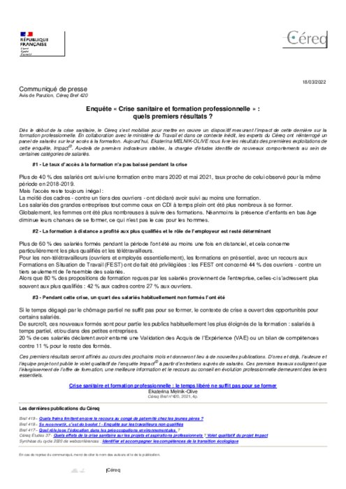 Métiers 18 mars 2022 - 08:00 Dès le début de la crise sanitaire, le Céreq s’est mobilisé pour mettre en œuvre un dispositif mesurant l’impact de cette dernière sur la formation professionnelle. PDF (209 Ko) Télécharger