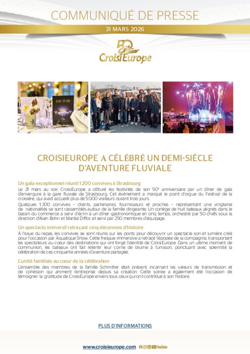 Le 21 mars au soir, CroisiEurope a clôturé les festivités de son 50e anniversaire par un dîner de gala d’envergure à la gare fluviale de Strasbourg. Cet événement a marqué le point d’orgue du Festival de la croisière, qui avait accueilli plus de 5 000 visiteurs durant trois jours.