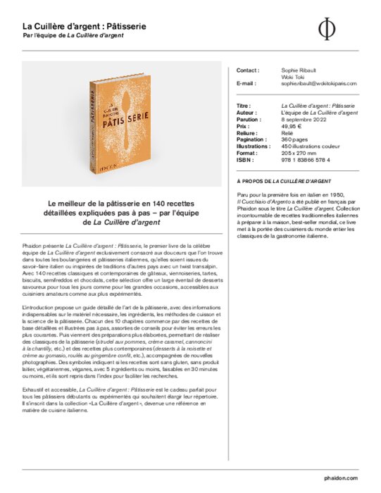 Phaidon présente La Cuillère d’argent : Pâtisserie, le premier livre de la célèbre équipe de La Cuillère d’argent exclusivement consacré aux douceurs que l’on trouve dans toutes les boulangeries et pâtisseries italiennes, qu’elles soient issues du savoir-faire italien ou inspirées de traditions d’autres pays avec un twist transalpin.