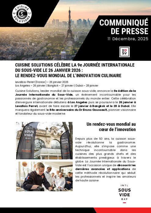 Cuisine Solutions, leader mondial de la cuisson sous-vide, annonce la 9e édition de la Journée Internationale du Sous-Vide, un événement incontournable pour les passionnés de gastronomie et les professionnels du monde entier. Cette célébration d’envergure internationale débutera à Los Angeles puis se poursuivra le 26 janvier à Levallois Perret, avant de faire escale le 27 janvier à Bangkok et le 28 à Dubaï. Elle marquera également le 84e anniversaire du Dr Bruno Goussault, pionnier visionnaire et fondateur du sous-vide moderne.