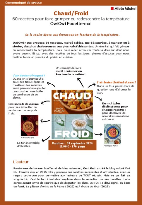 OwiOwi nous propose 60 recettes, moitié salées, moitié sucrées, à manger ou à siroter, des plus chaleureuses aux plus rafraîchissantes. Un éventail qui fait grimper ou redescendre la température, pour aider à trouver toute la douceur dans les plats. Et ça, avec des recettes de tous les jours, pleines d’astuces pour faciliter la vie et prendre du plaisir en cuisine.