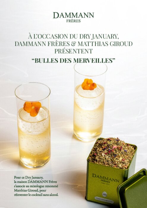A l’occasion du Dry January, Dammann Frères et le mixologue renommé Matthias Giroud présentent « Bulles des Merveilles », un cocktail sans alcool. Au cœur de cette collaboration: la Tisane des Merveilles, un blend emblématique de la Maison, ode à la nature et au savoir-faire artisanal.