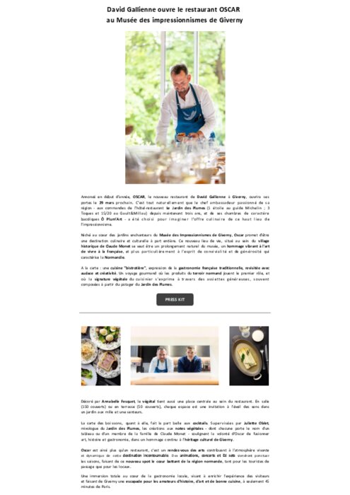 Annoncé en début d’année, Oscar , le nouveau restaurant de David Gallienne à Giverny, ouvrira ses portes le 29 mars . C’est tout naturellement que le chef ambassadeur passionné de sa région ‐ aux commandes de l’hôtel‐restaurant Le Jardin des Plumes (1 étoile au guide Michelin ; 3 Toques et 15/20 au Gault et Millau) depuis maintenant trois ans, et de ses chambres de caractère bucoliques Ô Plum’Art ‐ a été choisi pour imaginer l'offre culinaire de ce haut lieu de l’impressionnisme.