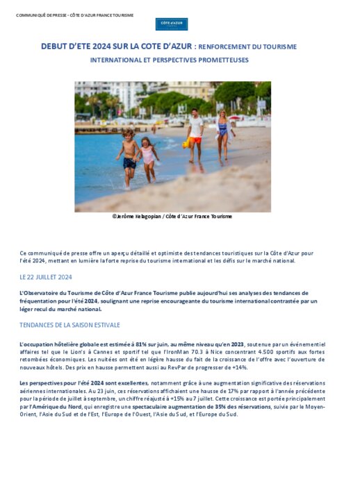 L’occupation hôtelière globale est estimée à 81% sur juin, au même niveau qu’en 2023, soutenue par un événementiel affaires tel que le Lion’s à Cannes et sportif tel que l’IronMan 70.3 à Nice concentrant 4.500 sportifs aux fortes retombées économiques. Les nuitées ont été en légère hausse du fait de la croissance de l’offre avec l’ouverture de nouveaux hôtels. Des prix en hausse permettent aussi au RevPar de progresser de +14%.