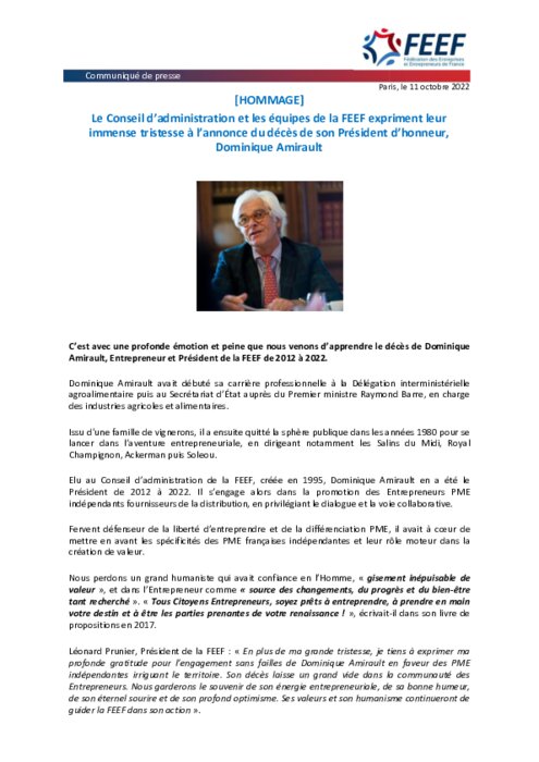 Métiers 11 octobre 2022 - 09:48 Dominique Amirault avait débuté sa carrière professionnelle à la Délégation interministérielle agroalimentaire puis au Secrétariat d’État auprès du Premier ministre Raymond Barre, en charge des industries agricoles et alimentaires. PDF (241 Ko) Télécharger