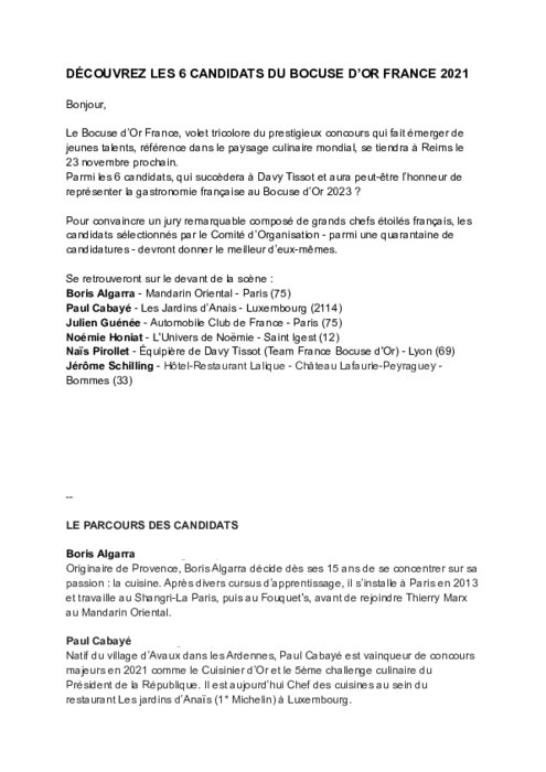 Métiers 04 novembre 2021 - 17:01 Le Bocuse d’Or France, volet tricolore du prestigieux concours qui fait émerger de jeunes talents, référence dans le paysage culinaire mondial, se tiendra à Reims le 23 novembre prochain. PDF (221 Ko) Télécharger