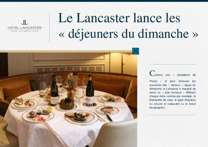 Comme une « madeleine de Proust » et pour retrouver les souvenirs des « fameux » repas du dimanche, le Lancaster a imaginé de servir un « plat iconique » différent chaque mois, comme par exemple, la blanquette de veau, le gigot d’agneau ou encore le cassoulet ou le bœuf bourguignon.