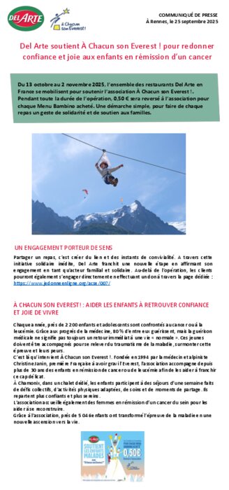 Parce qu’un simple repas peut devenir un élan de solidarité, Del Arte lance une opération nationale du 13 octobre au 2 novembre au profit de l’association À Chacun son Everest ! Pendant toute la durée de l’initiative, 0,50 € sera reversé à l’association pour chaque Menu Bambino acheté dans l’ensemble des 190 restaurants Del Arte en France. Une démarche simple, porteuse de sens, qui permet de transformer un moment convivial en un geste concret pour aider les enfants en rémission d’un cancer à retrouver confiance et joie de vivre.
