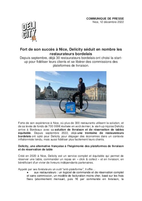 Forte de son expérience à Nice, où plus de 300 restaurants utilisent la solution, et de sa levée de fonds de 700 000€ réalisée en août dernier, la start-up niçoise Delicity arrive à Bordeaux avec sa solution de livraison et de réservation de tables équitable.