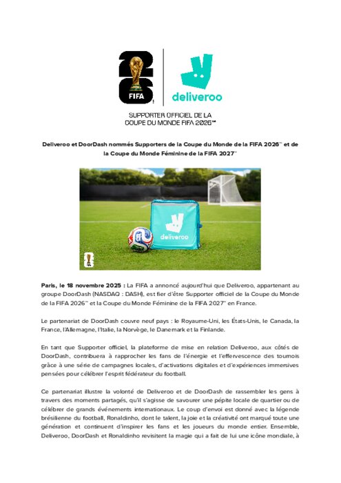 En tant que Supporter officiel, la plateforme de mise en relation Deliveroo, aux côtés de DoorDash, contribuera à rapprocher les fans de l’énergie et l’effervescence des tournois grâce à une série de campagnes locales, d’activations digitales et d’expériences immersives pensées pour célébrer l’esprit fédérateur du football.