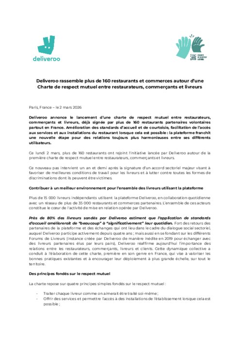 Deliveroo annonce le lancement d’une charte de respect mutuel entre restaurateurs, commerçants et livreurs, déjà signée par plus de 160 restaurants partenaires volontaires partout en France. Amélioration des standards d’accueil et de courtoisie, facilitation de l’accès aux services et aux installations du restaurant lorsque cela est possible : la plateforme franchit une nouvelle étape pour des relations toujours plus harmonieuses entre ses différents utilisateurs.