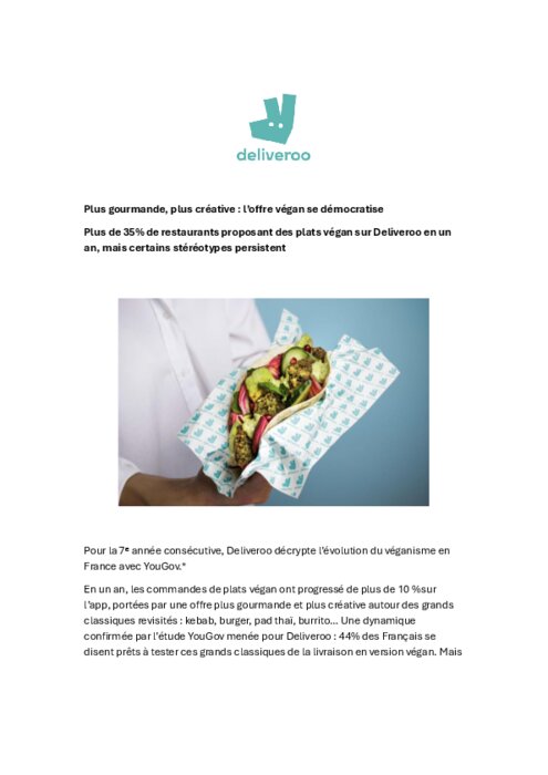 En un an, les commandes de plats végan ont progressé de plus de 10 % sur l’app, portées par une offre plus gourmande et plus créative autour des grands classiques revisités : kebab, burger, pad thaï, burrito… Une dynamique confirmée par l’étude YouGov menée pour Deliveroo : 44% des Français se disent prêts à tester ces grands classiques de la livraison en version végan.