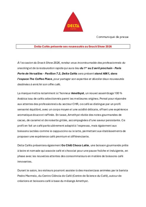 À l’occasion du Snack Show 2026, rendez-vous incontournable des professionnels du snacking et de la restauration rapide qui aura lieu du 1er au 2 avril - Paris Porte de Versailles - Pavillon 7.2, Delta Cafés sera présent stand A061, dans l’espace The Coffee Place, pour partager son expertise et dévoiler deux nouveautés destinées à enrichir son offre café.
