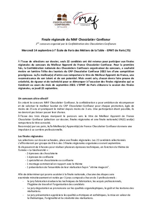 Métiers 21 septembre 2022 - 09:33 À l’issue de sélections sur dossier, seuls 22 candidats ont été retenus pour participer aux finales régionales du concours du Meilleur Apprenti de France Chocolatier Confiseur. PDF (277 Ko) Télécharger