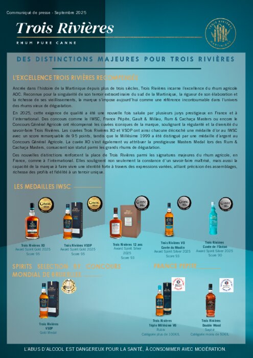 Forte de plus de trois siècles d’histoire en Martinique, la Maison Trois Rivières continue de faire rayonner l’excellence du rhum agricole AOC à travers le monde. En 2025, son savoir-faire d’exception a été salué par de nombreuses distinctions prestigieuses, tant en France qu’à l’international. Ces récompenses soulignent la régularité, la richesse et la précision qui font de Trois Rivières une référence incontournable dans l’univers des rhums de dégustation.