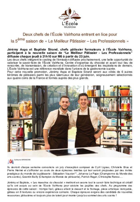 Métiers 20 juin 2022 - 09:15 Jérémy Aspa et Baptiste Sirand, chefs pâtissier formateurs à l’École Valrhona, participent à la nouvelle saison de “Le Meilleur Pâtissier - Les Professionnels” diffusée chaque jeudi à 21h10 sur M6 à partir du 23 juin. PDF (352 Ko) Télécharger
