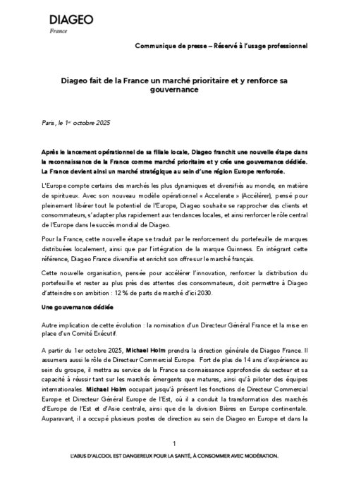 Après le lancement opérationnel de sa filiale locale, Diageo franchit une nouvelle étape dans la reconnaissance de la France comme marché prioritaire et y crée une gouvernance dédiée. La France devient ainsi un marché stratégique au sein d’une région Europe renforcée.