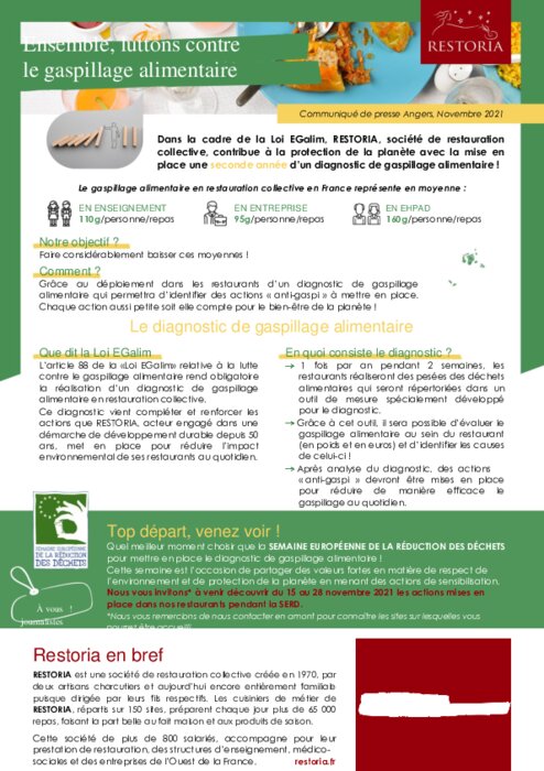 Restoria, société de restauration collective angevine, contribue à la protection de la planète avec la mise en place une seconde année d'un diagnostic de gaspillage alimentaire, du 15 au 28 novembre , sur l'ensemble de nos restaurants ! A l'issu, et selon les résultats obtenus, des actions anti-gaspi seront mises en place afin de réduire au maximum les déchets de nos convives.