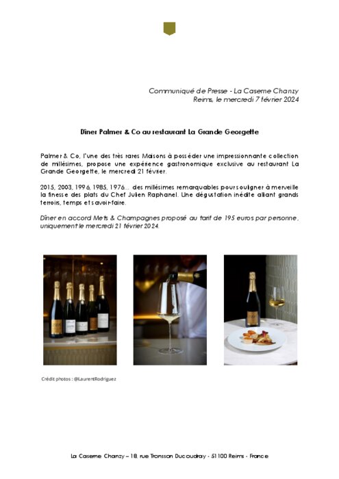 Palmer et Co, l’une des très rares Maisons à posséder une impressionnante collection de millésimes, propose une expérience gastronomique exclusive au restaurant La Grande Georgette, le mercredi 21 février. 2015, 2003, 1996, 1985, 1976… des millésimes remarquables pour souligner à merveille la finesse des plats du Chef Julien Raphanel. Une dégustation inédite alliant grands terroirs, temps et savoir-faire.