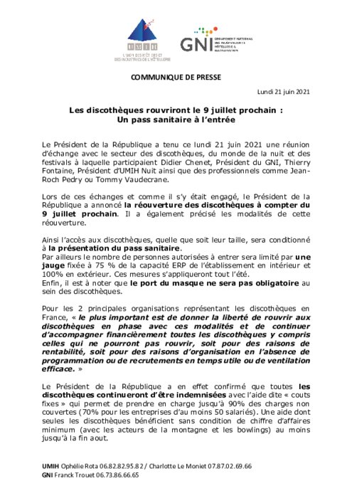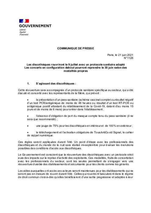 A l’occasion d’une réunion de travail autour du Président de la République et des représentants des entreprises du monde de la nuit, Roselyne Bachelot-Narquin, ministre de la Culture et Alain Griset, ministre délégué auprès du ministre de l’Economie, des Finances et de la Relance, chargé des Petites et Moyennes Entreprises ont annoncé que les concerts ou festivals en configuration debout pourront reprendre le 30 juin et que les discothèques pourront rouvrir à partir du 9 juillet prochain.