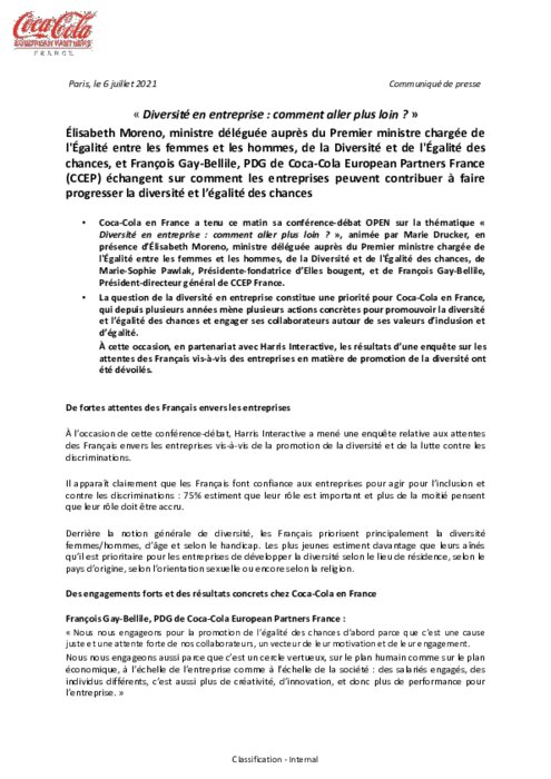 Élisabeth Moreno, ministre déléguée auprès du Premier ministre chargée de l'Égalité entre les femmes et les hommes, de la Diversité et de l'Égalité des chances, et François Gay-Bellile, PDG de Coca-Cola European Partners France (CCEP) échangent sur comment les entreprises peuvent contribuer à faire progresser la diversité et l’égalité des chances.
