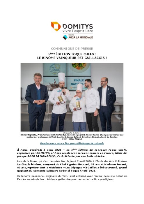 Lors de la finale, qui s’est déroulée le jeudi 2 avril à L’École des Arts Culinaires Lenôtre, le binôme, composé du chef Cyprien Boucard, 38 ans et Madame Rocaut, 85 ans, représentant la résidence « Les Cépages » à Gaillac a été couronné, grand gagnant du concours culinaire national Toque Chefs 2026.