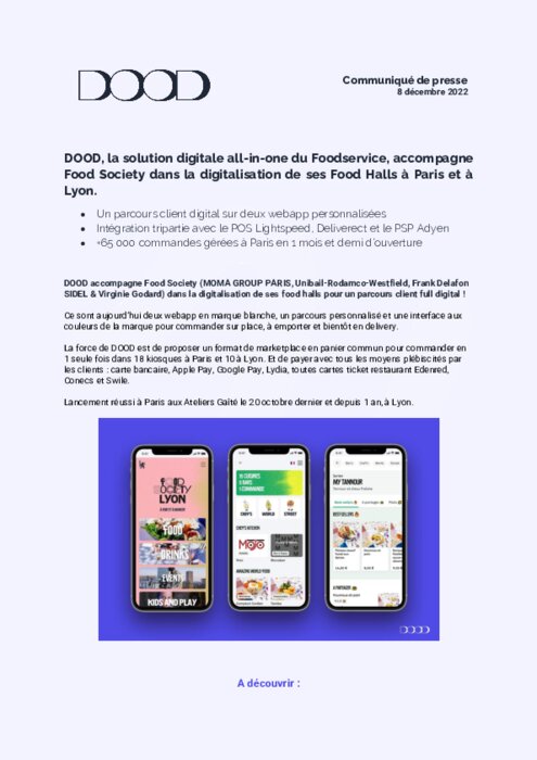 Fournisseurs 08 décembre 2022 - 14:35 Food Society propose une expérience de commande 100% digitale, et ce en collaboration avec DOOD. PDF (464 Ko) Télécharger
