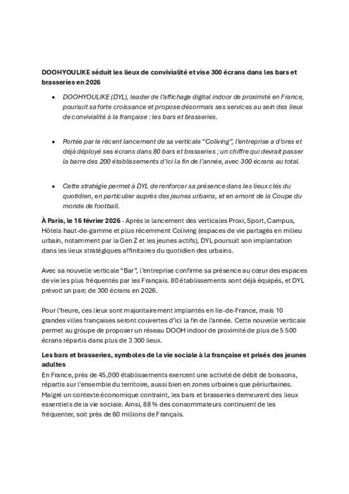 Après le lancement des verticales Proxi, Sport, Campus, Hôtels haut-de-gamme et plus récemment Coliving (espaces de vie partagés en milieu urbain, notamment par la Gen Z et les jeunes actifs), DYL poursuit son implantation dans les lieux stratégiques affinitaires du quotidien des urbains. Avec sa nouvelle verticale “Bar”, l’entreprise confirme sa présence au cœur des espaces de vie les plus fréquentés par les Français. 80 établissements sont déjà équipés, et DYL prévoit un parc de 300 écrans en 2026.