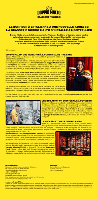 Doppio Malto, brasserie italienne mettant à l’honneur des bières artisanales et une cuisine authentique, ouvre un nouveau restaurant à Odysseum (Montpellier), mi-décembre. Déjà présente à Paris, Nice, Chambray-Lès-Tours, Bordeaux, et Laval, l’enseigne, leader des brasseries en Italie, poursuit son développement en France. Un nouveau chapitre qui s’ouvre dans la ville “Lo Clapas”, ville du partage… et désormais de la birra artigianale.