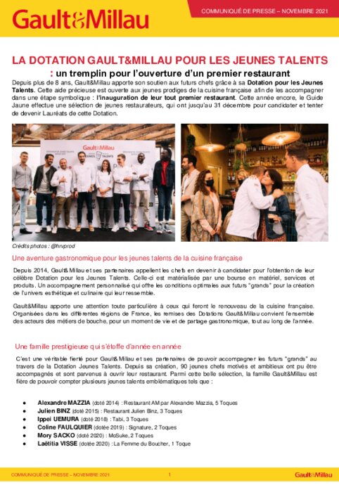 Métiers 10 novembre 2021 - 15:33 Cela fait plus de 8 ans que Gault&Millau apporte son soutien aux futurs chefs grâce à sa Dotation pour les Jeunes Talents. PDF (418 Ko) Télécharger