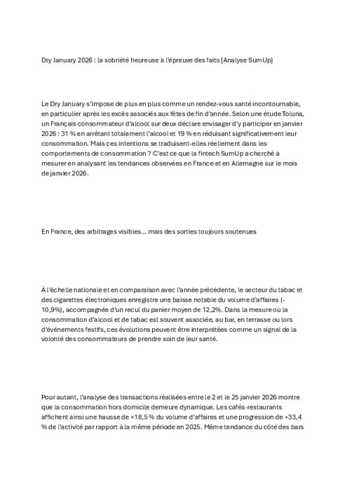 Le Dry January s’impose de plus en plus comme un rendez-vous santé incontournable, en particulier après les excès associés aux fêtes de fin d’année. Selon une étude Toluna, un Français consommateur d’alcool sur deux déclare y participer en janvier 2026 : 31 % en arrêtant totalement l’alcool et 19 % en réduisant significativement leur consommation. Mais ces intentions se traduisent-elles réellement dans les comportements de consommation ? C’est ce que la fintech SumUp a cherché à mesurer en analysant les tendances observées en France et en Allemagne sur le mois de janvier 2026.