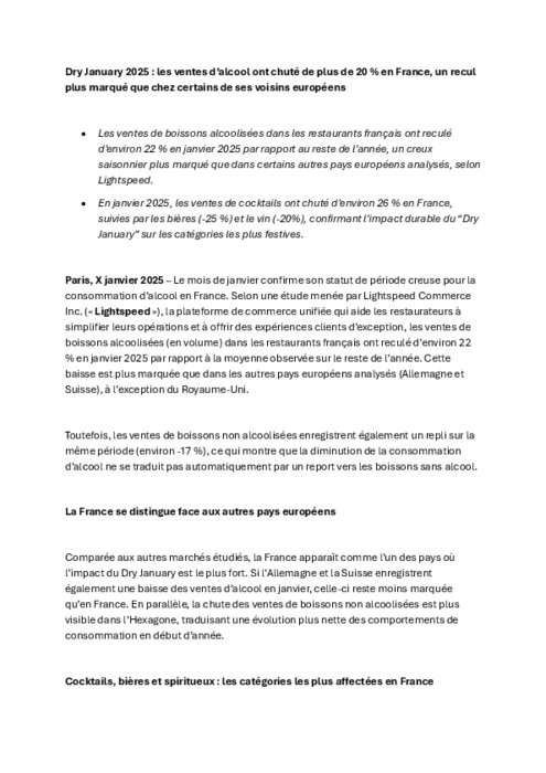 En attendant les chiffres de 2026 qui seront disponibles plus tard dans l’année, Lightspeed, la plateforme de commerce unifiée qui aide les restaurateurs à simplifier leurs opérations et à offrir des expériences clients d’exception, a réalisé une étude qui porte sur le suivi, dans quatre pays européens (France, Royaume-Uni, Allemagne et Suisse) du Dry January en janvier 2025.