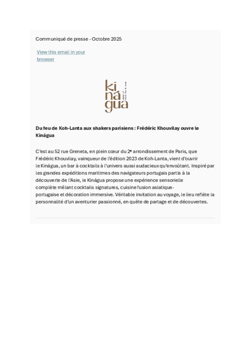 C’est au 52 rue Greneta, en plein cœur du 2ᵉ arrondissement de Paris, que Frédéric Khouvilay, vainqueur de l’édition 2023 de Koh-Lanta, vient d’ouvrir le Kinágua, un bar à cocktails à l’univers aussi audacieux qu’envoûtant. Inspiré par les grandes expéditions maritimes des navigateurs portugais partis à la découverte de l’Asie, le Kinágua propose une expérience sensorielle complète mêlant cocktails signatures, cuisine fusion asiatique-portugaise et décoration immersive. Véritable invitation au voyage, le lieu reflète la personnalité d’un aventurier passionné, en quête de partage et de découvertes.