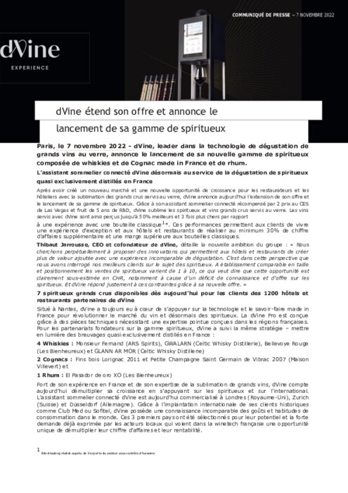 dVine, leader dans la technologie de dégustation de grands vins au verre, annonce le lancement de sa nouvelle gamme de spiritueux composée de whiskies et de Cognac made in France et de rhum.