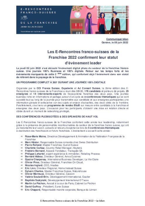Métiers 09 juin 2022 - 15:41 Le jeudi 02 juin 2022 s’est déroulé l’évènement digital phare du secteur de la franchise franco-suisse. Une journée 100% Business et 100% digitale. PDF (351 Ko) Télécharger