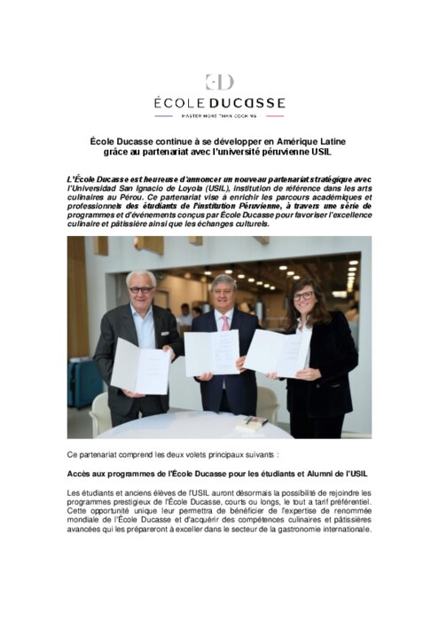 L’École Ducasse est heureuse d'annoncer un nouveau partenariat stratégique avec l'Universidad San Ignacio de Loyola (USIL), institution de référence dans les arts culinaires au Pérou. Ce partenariat vise à enrichir les parcours académiques et professionnels des étudiants de l’institution Péruvienne, à travers une série de programmes et d'événements conçus par École Ducasse pour favoriser l'excellence culinaire et pâtissière ainsi que les échanges culturels.