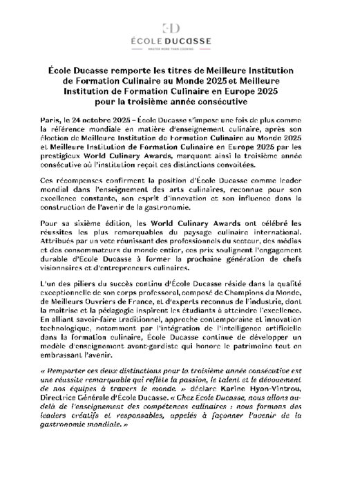 École Ducasse s’impose une fois de plus comme la référence mondiale en matière d’enseignement culinaire, après son élection de Meilleure Institution de Formation Culinaire au Monde 2025 et Meilleure Institution de Formation Culinaire en Europe 2025 par les prestigieux World Culinary Awards, marquant ainsi la troisième année consécutive où l’institution reçoit ces distinctions convoitées.