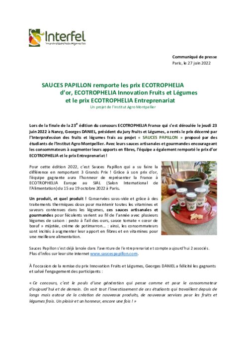 Lors de la finale de la 23e édition du concours ECOTROPHELIA France qui s'est déroulée le jeudi 23 juin 2022 à Nancy, Georges DANIEL, président du jury Fruits et Légumes, a remis le prix décerné par l'Interprofession des fruits et légumes frais au projet « SAUCES PAPILLON » proposé par des étudiants de l'Institut Agro Montpellier.