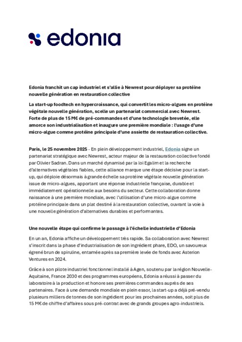 La start-up foodtech en hypercroissance, qui convertit les micro-algues en protéine végétale nouvelle génération, scelle un partenariat commercial avec Newrest. Forte de plus de 15 M€ de pré-commandes et d’une technologie brevetée, elle amorce son industrialisation et inaugure une première mondiale : l’usage d’une micro-algue comme protéine principale d’une assiette de restauration collective.