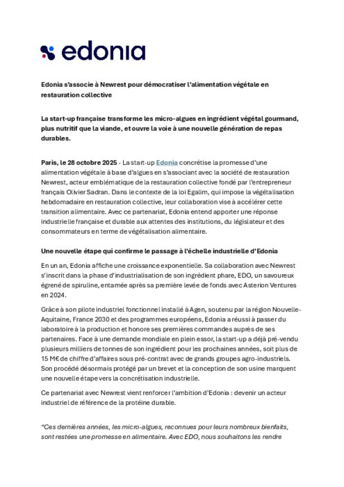 La start-up Edonia concrétise la promesse d’une alimentation végétale à base d’algues en s’associant avec la société de restauration Newrest, acteur emblématique de la restauration collective fondé par l’entrepreneur français Olivier Sadran. Dans le contexte de la loi Egalim, qui impose la végétalisation hebdomadaire en restauration collective, leur collaboration vise à accélérer cette transition alimentaire. Avec ce partenariat, Edonia entend apporter une réponse industrielle française et durable aux attentes des institutions, du législateur et des consommateurs en terme de végétalisation alimentaire.