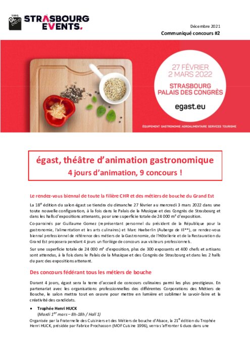 La 18e édition du salon égast se tiendra du dimanche 27 février au mercredi 3 mars 2022 dans une toute nouvelle configuration, à la fois dans le Palais de la Musique et des Congrès de Strasbourg et dans les halls d’expositions attenants, pour une superficie totale de 24 000 m² d’exposition.