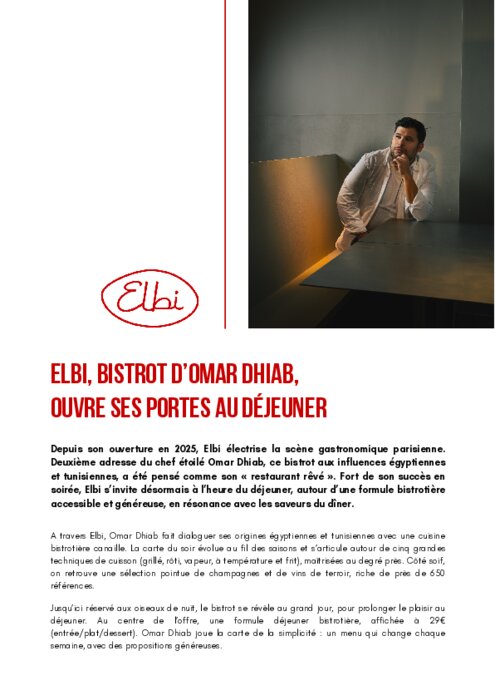 Depuis son ouverture en 2025, Elbi électrise la scène gastronomique parisienne. Deuxième adresse du chef étoilé Omar Dhiab, ce bistrot aux influences égyptiennes et tunisiennes, a été pensé comme son « restaurant rêvé ». Fort de son succès en soirée, Elbi s’invite désormais à l’heure du déjeuner, autour d’une formule bistrotière accessible et généreuse, en résonance avec les saveurs du dîner.