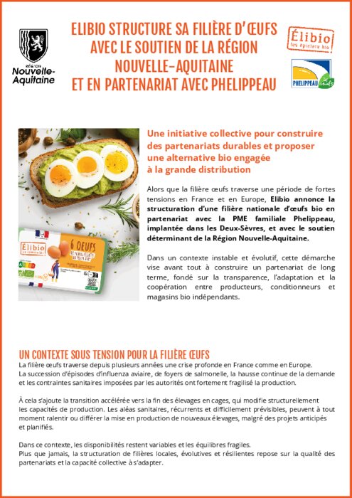 Dans un contexte de fortes tensions sur la filière œufs en France, Elibio annonce la structuration d’une filière nationale d’œufs bio construite en partenariat avec la PME familiale Phelippeau, implantée dans les Deux-Sèvres, et avec le soutien de la Région Nouvelle-Aquitaine.