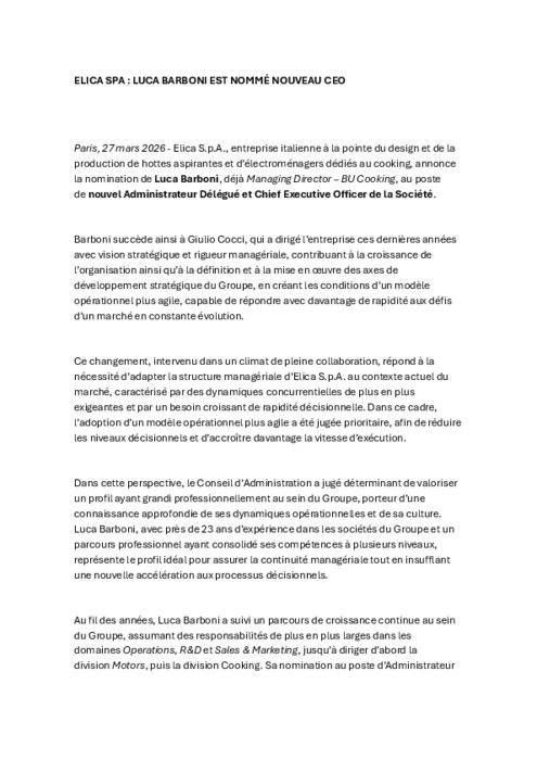 ELICA SPA : LUCA BARBONI EST NOMMÉ NOUVEAU CEO