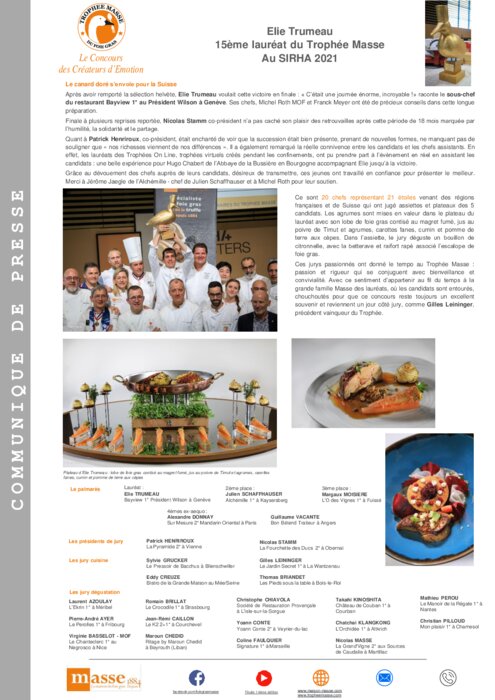 Métiers 29 septembre 2021 - 13:25 Après avoir remporté la sélection helvète, Elie Trumeau voulait cette victoire en finale : « C’était une journée énorme, incroyable !» raconte le sous-chef du restaurant Bayview 1* au Président Wilson à Genève PDF (1 Mo) Télécharger