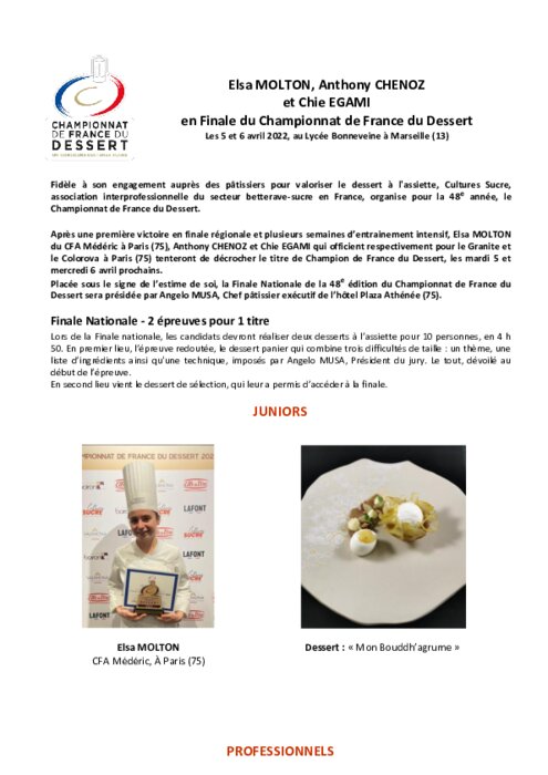 Fidèle à son engagement auprès des pâtissiers pour valoriser le dessert à l'assiette, Cultures Sucre, association interprofessionnelle du secteur betterave-sucre en France, organise pour la 48e année, le Championnat de France du Dessert.